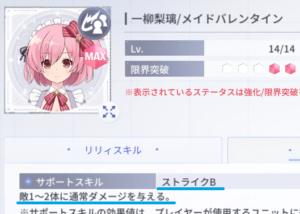 「一柳梨璃/メイドバレンタイン」のサポートスキルですが、「ストライクB」で、「敵1~2体に通常ダメージを与える。」が正しいようです。ご確認をお願いいたします。